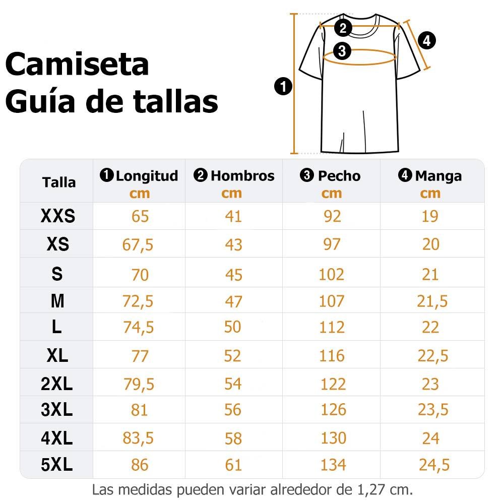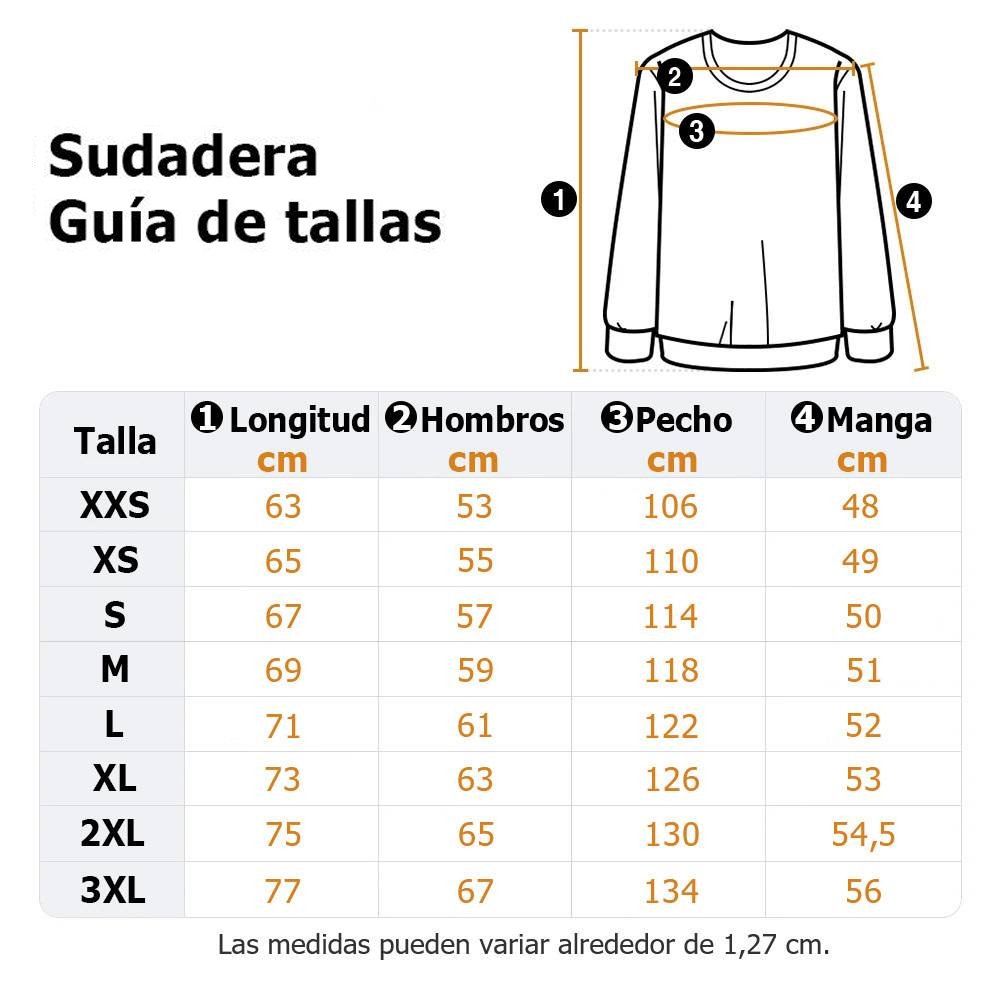 | Medidas: | Camiseta - XXS, XS, S, M, L, XL, 2XL, 3XL, 4XL, 5XL Sudadera - XXS, XS, S, M, L, XL, 2XL, 3XL Sudadera con capucha - XXS, XS, S, M, L, XL, 2XL, 3XL |