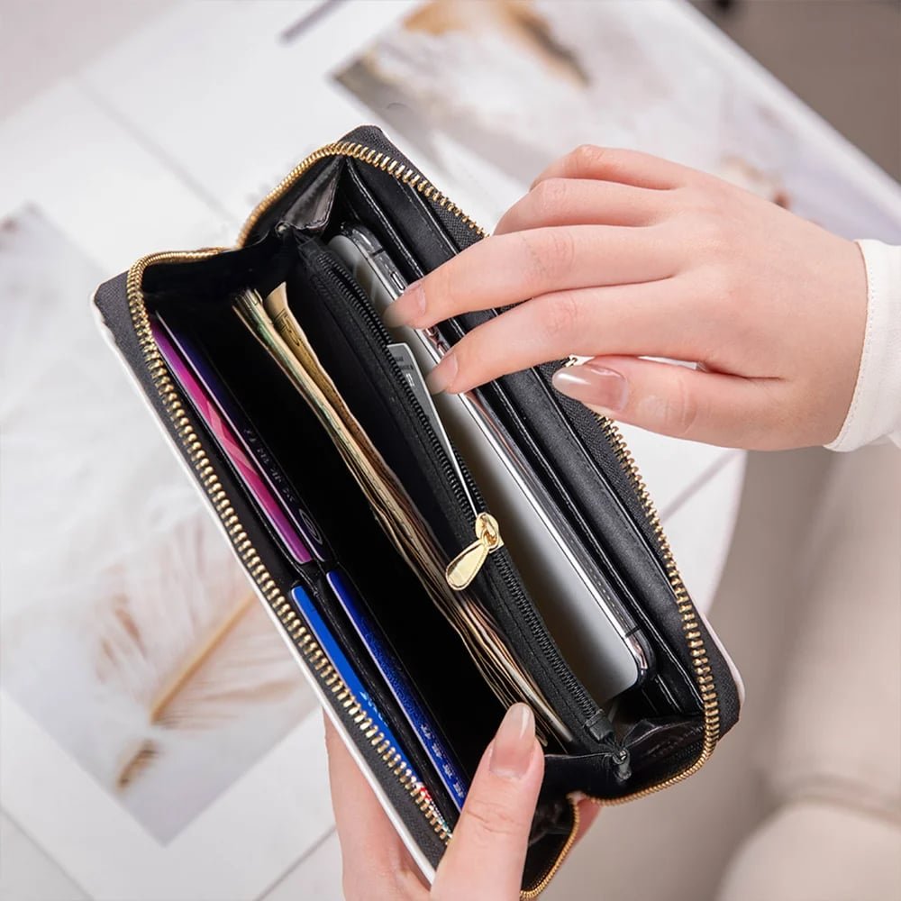 Con múltiples ranuras para tarjetas, bolsillos con cremallera y un compartimento para billetes de longitud completa, esta cartera ofrece un amplio espacio de almacenamiento para tarjetas, monedas y más. Su diseño permite mantener todo organizado, incluso en viajes, sin necesidad de llevar varias carteras. Es perfecta para ir de compras o salir, garantizando un fácil acceso a tus objetos esenciales.